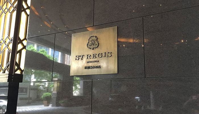 在標識設計的時候,主要以青古銅結合裝修的色彩搭配。瑞吉酒店標牌把瑞吉酒店展現的淋漓盡致。